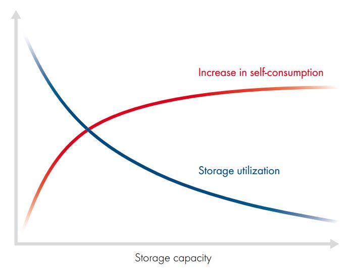 While the increase in self-consumption stagnates with larger storage capacity, the level of battery use is steadily decreasing. If a backup function is not needed, a smaller storage system is thus the more cost-effective choice.